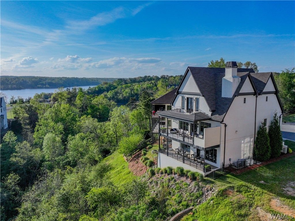 Enjoy Lake Tuscaloosa views from nearly every room in this custom 4BD/4BA estate in the gated Maison du Lac. Built with elite specs: painted brick, steel balconies & vintage shingles. Interior features stained concrete & hardwood floors, reclaimed beams & a dedicated wet bar. Chefs kitchen offers granite/quartzite tops & custom cabinetry. The primary suite is a sanctuary with marble baths, balcony access & extra closet space. High-end perks include 2 laundry rooms, theatre room, spray-foam insulation & masonry grill. Unrivaled outdoor living with 3 levels of steel balconies, wood ceilings & a personal rooftop sundeck showcasing breathtaking water scenery. Skip the stairs?the neighborhood tram leads to your boat dock. Maison du Lac at its finest.
